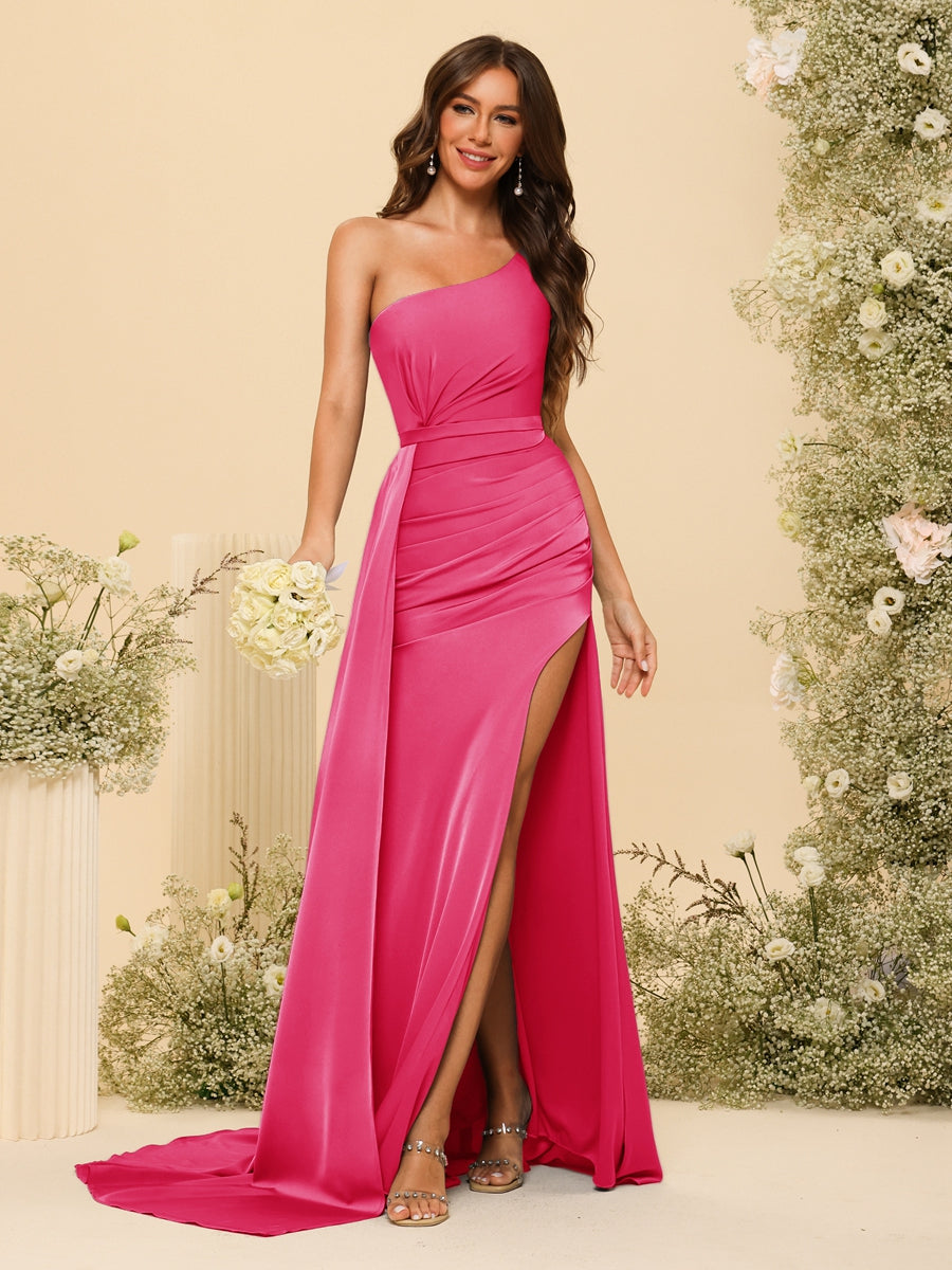 Sheath/Column One-Shoulder Long Formal Dresses with Split Side & Ruched