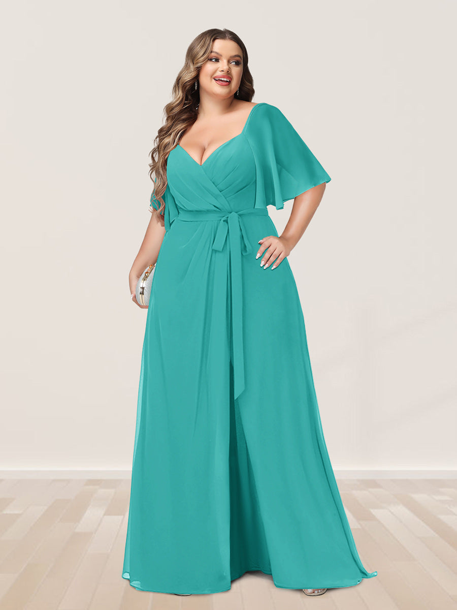 A-Line/Princess V-Neck Half Sleeves Plus Size Bridesmaid Dresses with Split Side